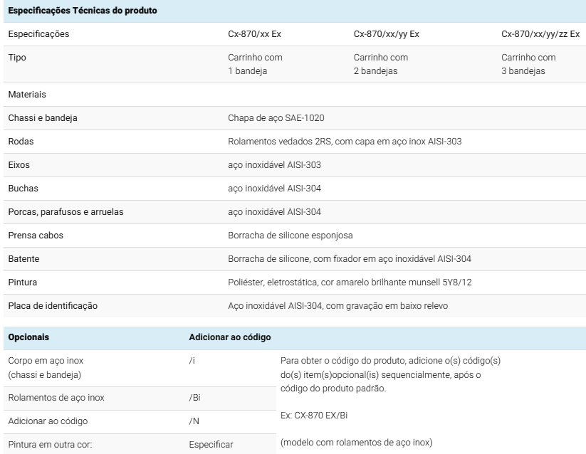 | Corpo em aço inox (chassi e bandeja) | /i | Para obter o código do produto, adicione o(s) código(s) do(s) item(s)opcional(is) sequencialmente, após o código do produto padrão. Ex: CX-870 EX/Bi (modelo com rolamentos de aço inox) |