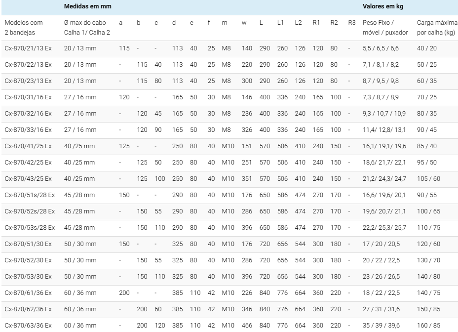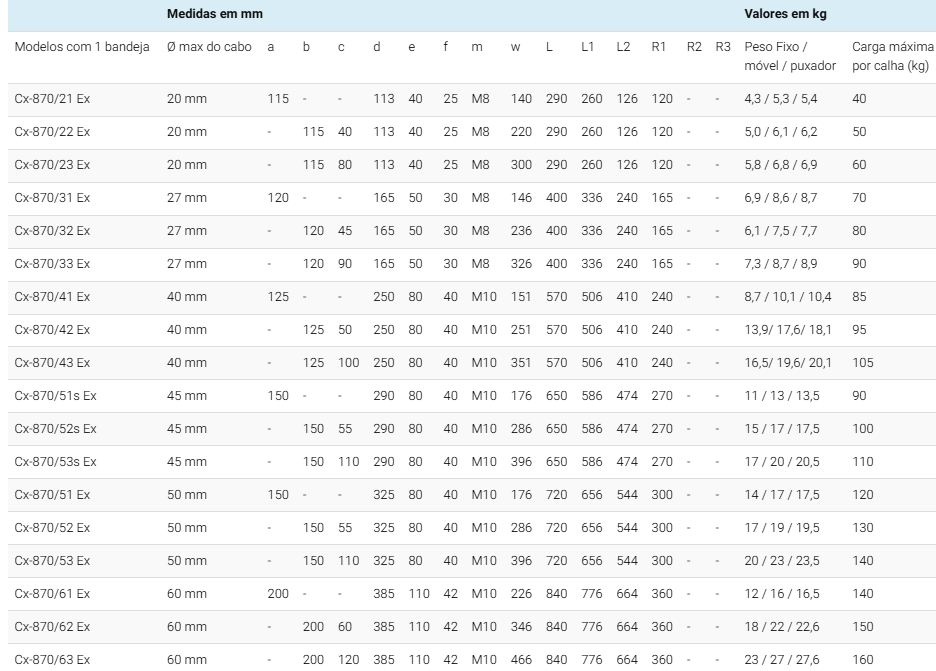 | Modelos com 1 bandeja | Ø max do cabo | a | b | c | d | e | f | m | w | L | L1 | L2 | R1 | R2 | R3 | Peso Fixo / móvel / puxador | Carga máxima por calha (kg) |