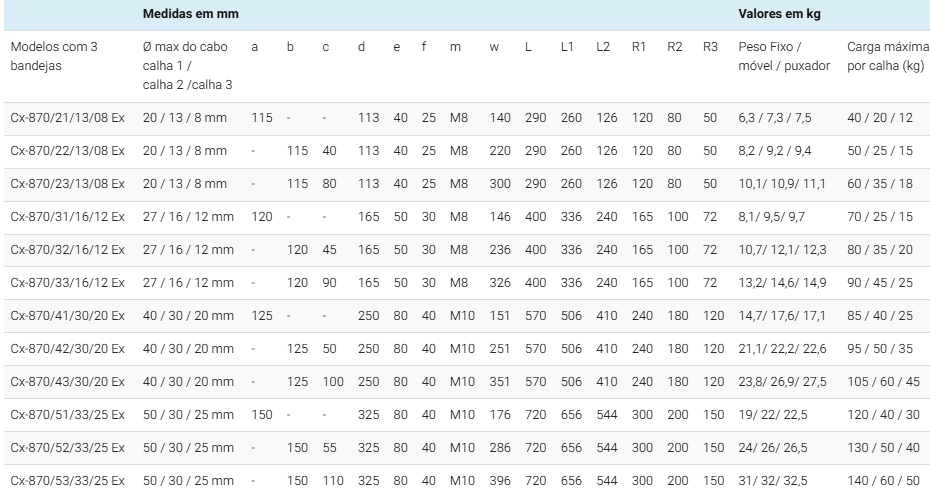 | Modelos com 3 bandejas | Ø max do cabo calha 1 / calha 2 /calha 3 | a | b | c | d | e | f | m | w | L | L1 | L2 | R1 | R2 | R3 | Peso Fixo / móvel / puxador | Carga máxima por calha (kg) |