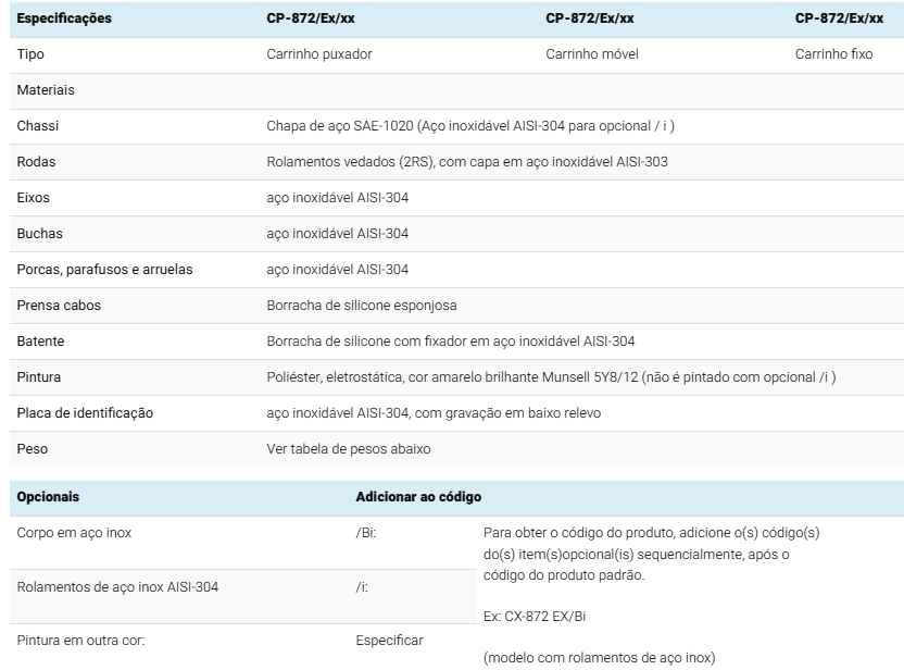 | Especificações | CP-872/Ex/xx | CP-872/Ex/xx | CP-872/Ex/xx |