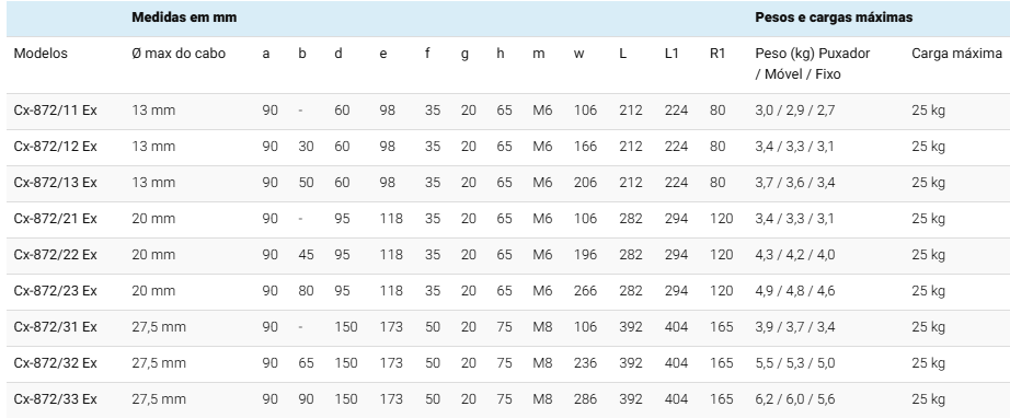 | Modelos | Ø max do cabo | a | b | d | e | f | g | h | m | w | L | L1 | R1 | Peso (kg) Puxador / Móvel / Fixo | Carga máxima |