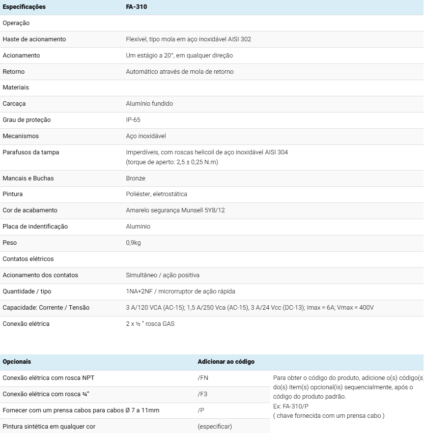 | Conexão elétrica com rosca NPT | /FN | Para obter o código do produto, adicione o(s) código(s) do(s) item(s) opcional(is) sequencialmente, após o código do produto padrão. Ex: FA-310/P ( chave fornecida com um prensa cabo ) |