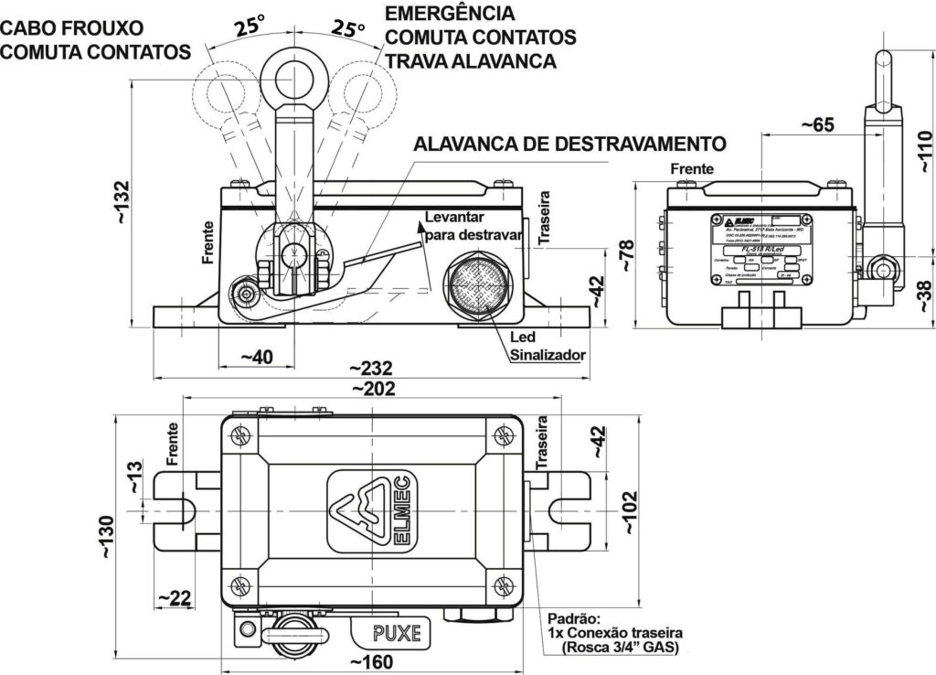| Alavanca de acionamento | 25° : parada de emergência -25° : sinalização de cabo rompido |