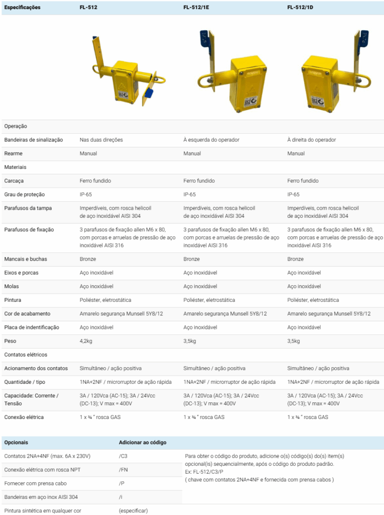 | Contatos 2NA+4NF (max. 6A x 230V) | /C3 | Para obter o código do produto, adicione o(s) código(s) do(s) item(s) opcional(is) sequencialmente, após o código do produto padrão. Ex: FL-512/C3/P ( chave com contatos 2NA+4NF e fornecida com prensa cabos ) |