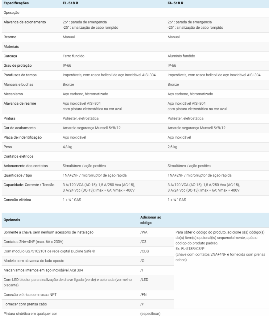 | Somente a chave, sem nenhum acessório de instalação | /WA | Para obter o código do produto, adicione o(s) código(s) do(s) item(s) opcional(is) sequencialmente, após o código do produto padrão. Ex: FL-518R/C3/P (chave com contatos 2NA+4NF e fornecida com prensa cabos) |