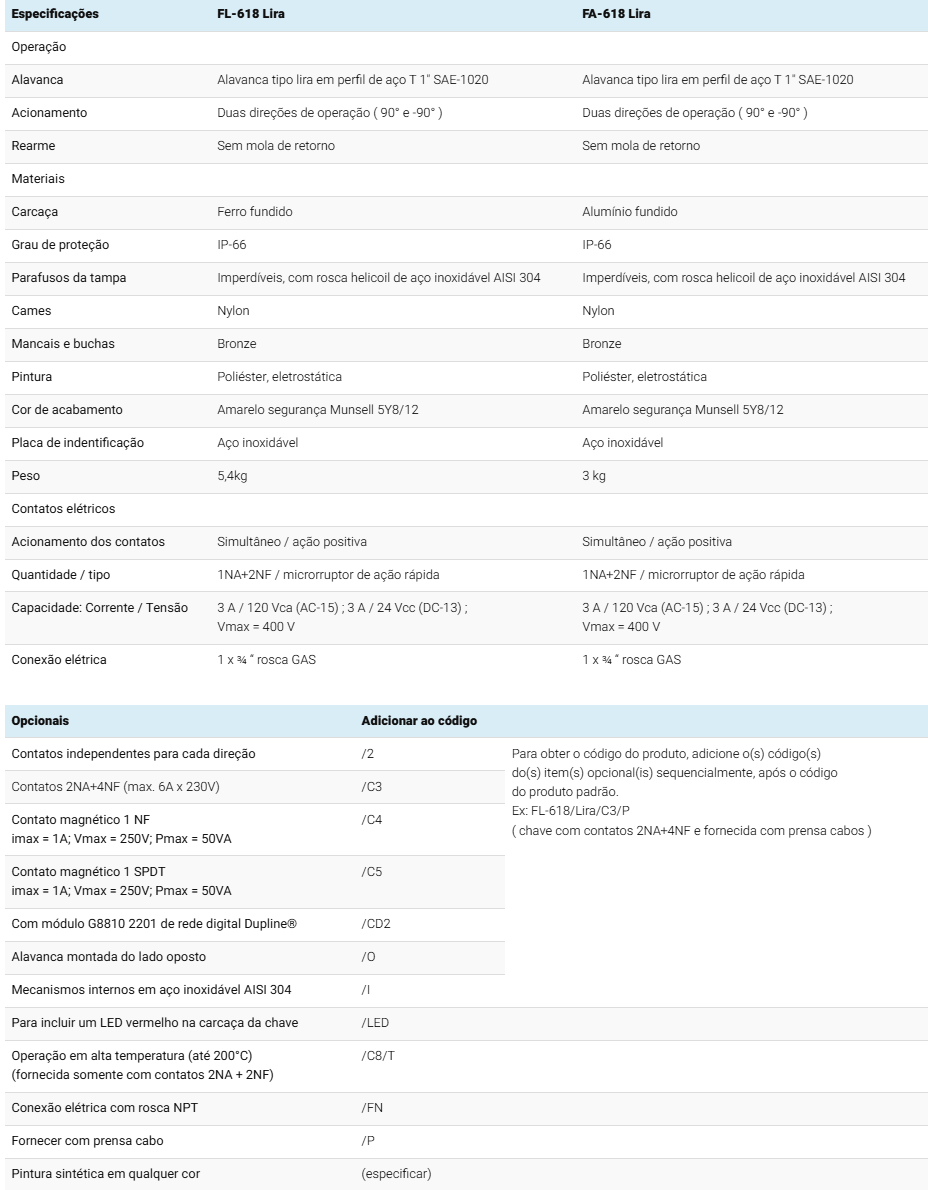 | Contatos independentes para cada direção | /2 | Para obter o código do produto, adicione o(s) código(s) do(s) item(s) opcional(is) sequencialmente, após o código do produto padrão. Ex: FL-618/Lira/C3/P ( chave com contatos 2NA+4NF e fornecida com prensa cabos ) |