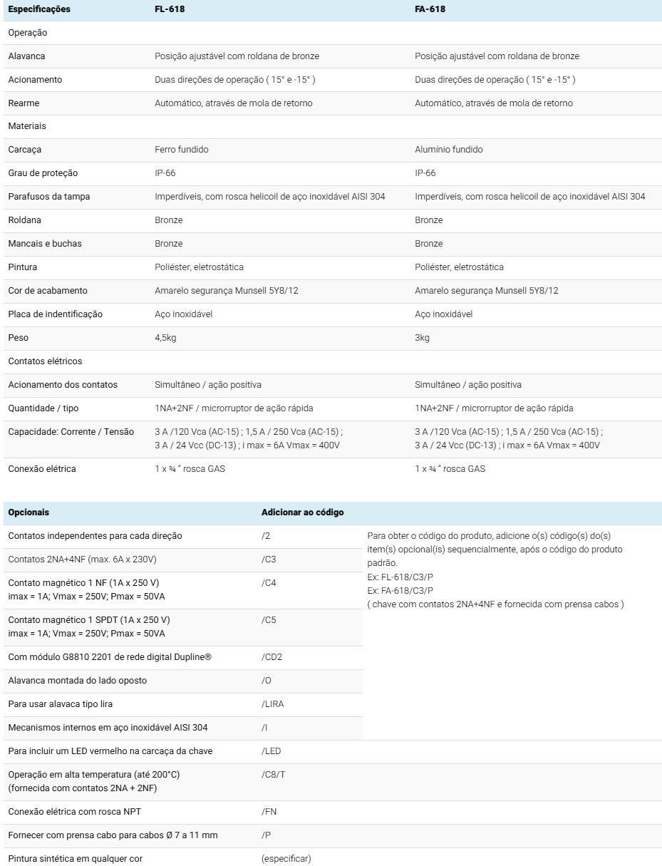 | Contatos independentes para cada direção | /2 | Para obter o código do produto, adicione o(s) código(s) do(s) item(s) opcional(is) sequencialmente, após o código do produto padrão. Ex: FL-618/C3/P Ex: FA-618/C3/P ( chave com contatos 2NA+4NF e fornecida com prensa cabos ) |